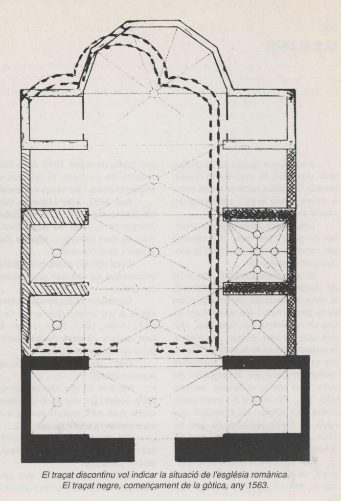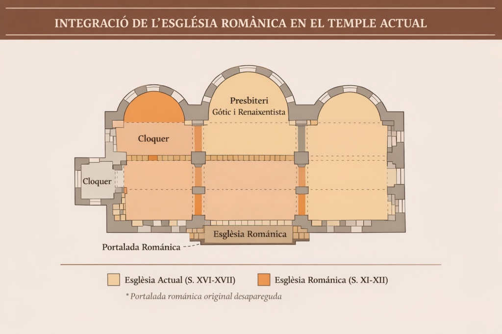 L’edifici romànic devia ser un temple de certa categoria, possiblement amb tres naus, tal com s’ha deduït a partir dels vestigis de murs i arcades identificats i integrats en les parets de la construcció posterior. Hi ha alguns testimonis que indiquen que podia tenir absis semicirculars, un petit cloquer i una portalada amb arcades i capitells senzills, característics del romànic dels segles XI i XII.