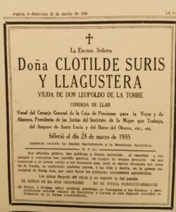 Va morir el 23 de març de 1935. La comtessa va morir sense familiars directes; l’esquela en fa testimoni. Les seves pertinences domèstiques varen ser repartides entre el servei. És per això que a casa la tia Càndida (que era l’«ama de llaves» de la Clotilde) hi havia objectes d’un possible valor. La tia Candieta —així li dèiem— es deia Càndida Alemany Dausà, casada amb Inocencio Juvert; feia flors de roba. La comtessa devia ser una tia-àvia, doncs era germana de l’àvia materna de la Candieta. També crec que era tia-besàvia de Fina Surís Ripoll, del carrer Ample, igual que tia-rebesàvia de mi mateix. Tant la tia Candieta com la Fina Surís vivien al carrer Ample als números 21 i 23: molta casualitat quan totes dues eren parents de la Clotilde Suris (última fotografia).