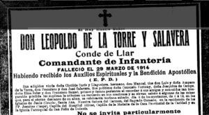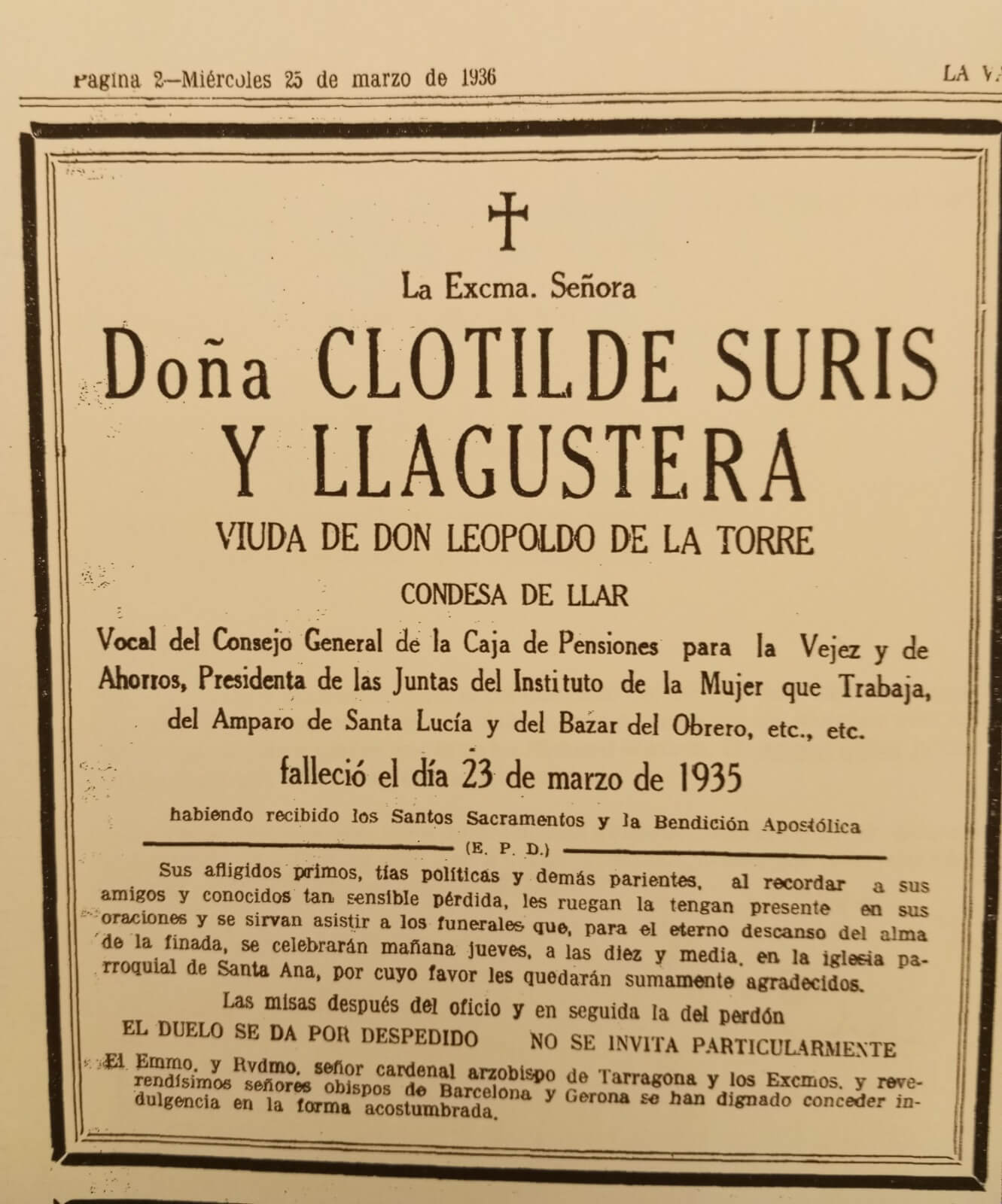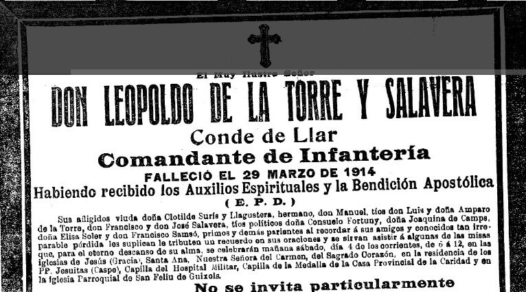 La senyora Clotilde Suris es casa (segurament en un matrimoni de conveniència: ella, rica hereva, i ell, amb títol mobiliari) amb «Don Leopoldo de la Torre y Salavera, 7è comte de Llar, comandante de Infantería», mort el 29 de març de 1914. El matrimoni no va tenir fills.